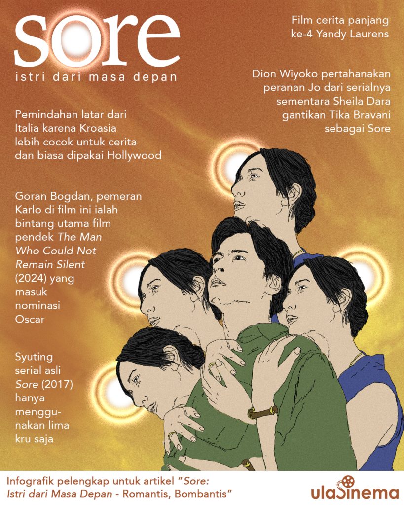 Yandy Laurens lanjutkan roket sinema dramanya dengan mendaur ulang serial webnya, Sore: Istri dari Masa Depan (2025). Melanjutkan kesuksesan serialnya, Jatuh Cinta Seperti di Film-Film (2023), dan Satu Kakak Tujuh Ponakan (2024), ekspektasi ini begitu tinggi. Laurens pun menemuinya dengan jalan cerita yang sangat eksperimental.